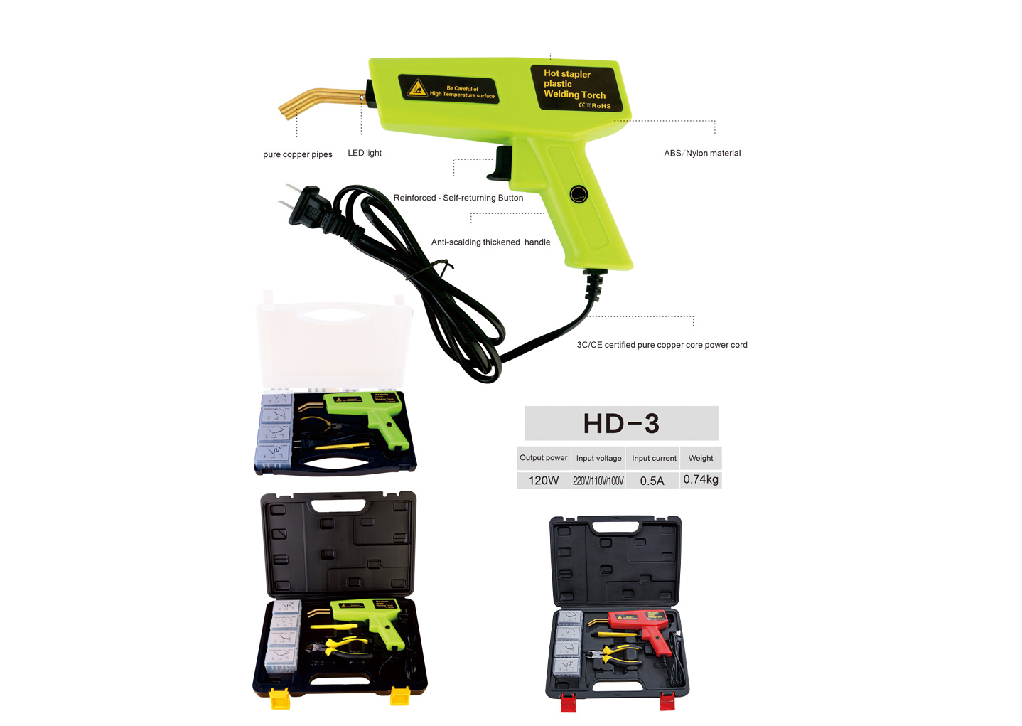 Gun type high-power plastic welder x1 100 pcs boxed welding nails x4 Utillity knife x1 Large diagonal pliers x1 Instruction manual x1 blow molding box x1 |