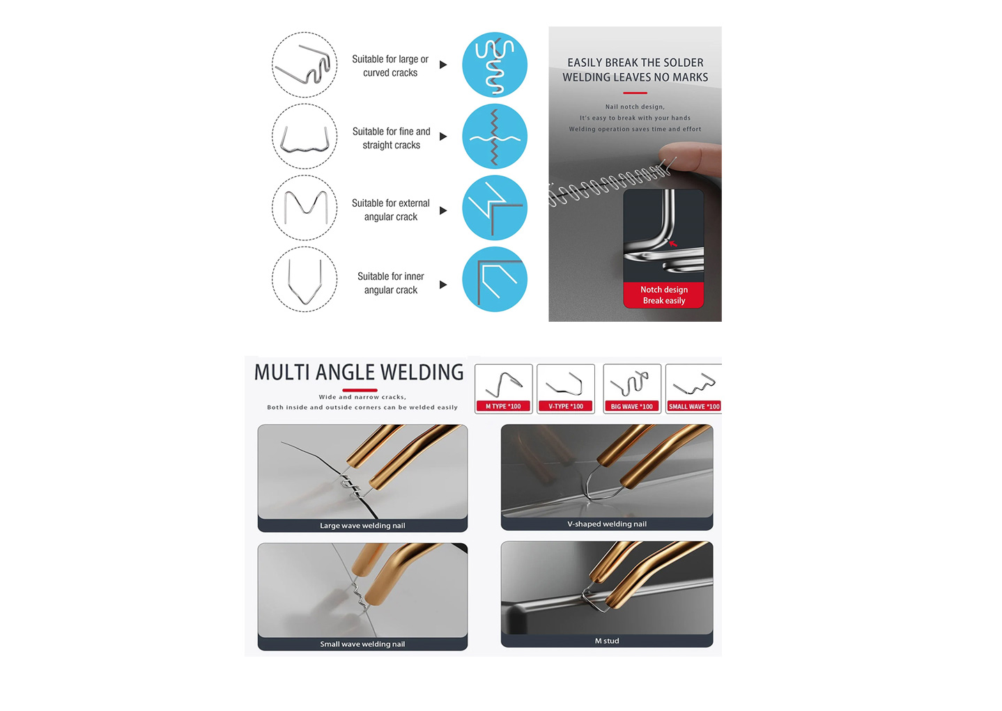 The welding nail adopts a notch design allowing for easy breaking-off, which makes the welding operation time-saving and labor-efficient.